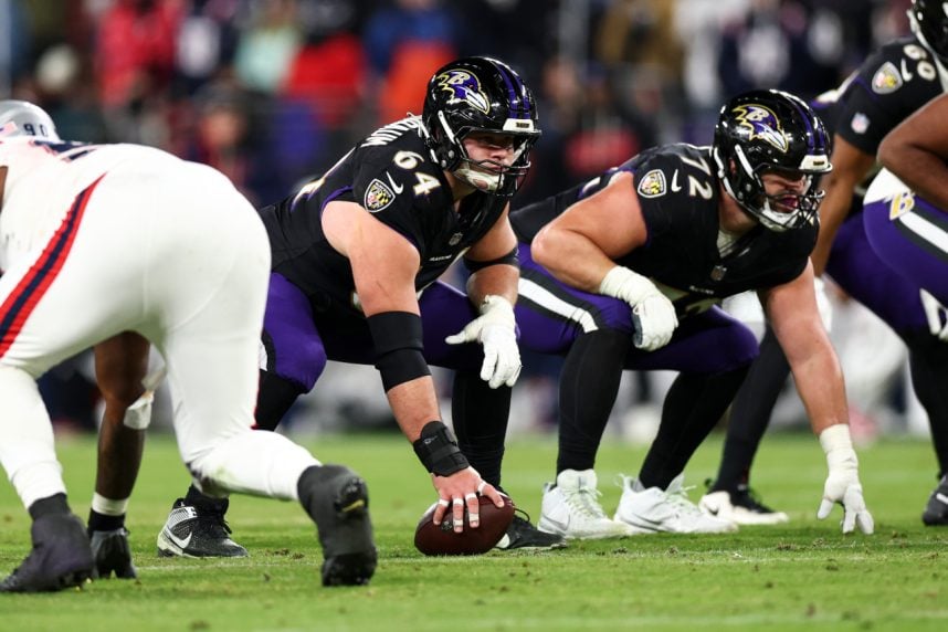 Tyler Linderbaum of the Baltimore Ravens lines up before a play during an NFL football game against the New England Patriots at M&T Bank Stadium last December in Baltimore, Maryland. (Image: Kevin Sabitus/Getty Images)